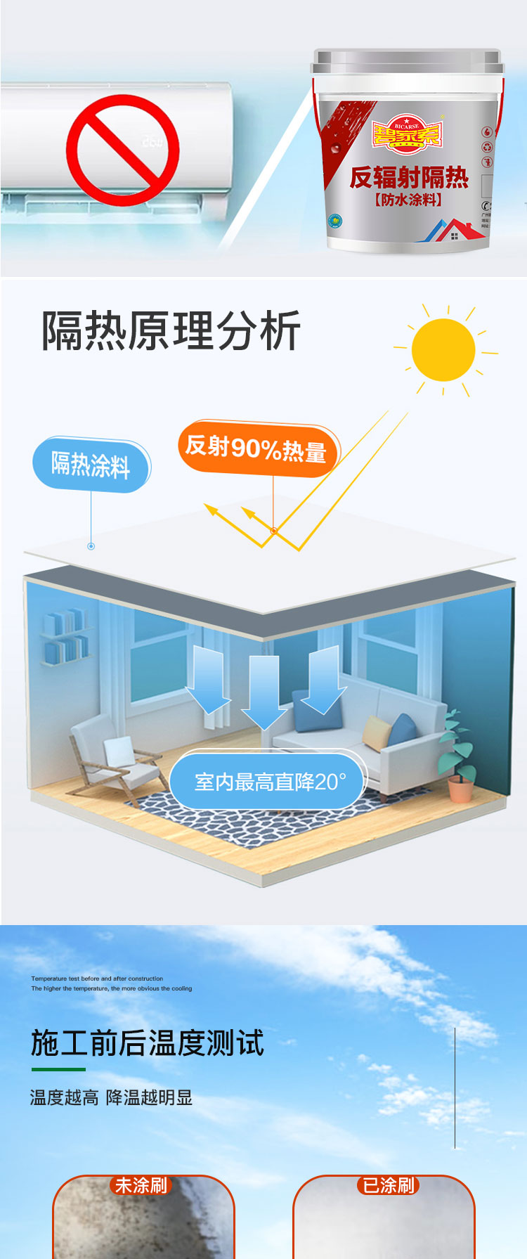 碧家索反辐射隔热防水涂料是由导热系数极低的空心微珠绝热材料、具有很强的电磁波屏蔽性的纳米碳管及氮化物、金属氧化物等热反射材料和辐射材料和助剂等组成是集反射、辐射与隔热为一体的新型降温涂料,具有装饰和隔热的双重功能的薄层反射隔热涂料。涂料能对400nm-2500nm范围的太阳红外线和紫外线进行高反射,在阳光强烈时,反射了所有热辐射的约90%-95%,相当于10mm厚的R值为20的聚苯乙烯泡沫塑料,可以降低物体表面温度20°C以上,即使在阴天和夜晚涂料也能辐射热量降低温度,隔绝热能的传递,确保建筑物内部空间能保持持久恒温的状态;涂料对于涂刷细小的裂纹的基面有很多的防水防渗漏作用,涂刷完光滑平整,疏水性、自洁性能好,涂料添加了强力防霉剂,防藻剂可以长期防止生霉和长青苔,是一种高效降温、薄层、装饰、自洁、防水、防潮、防紫外线老化、耐酸碱、防腐于一体的新型常温降温节能长寿命涂料。