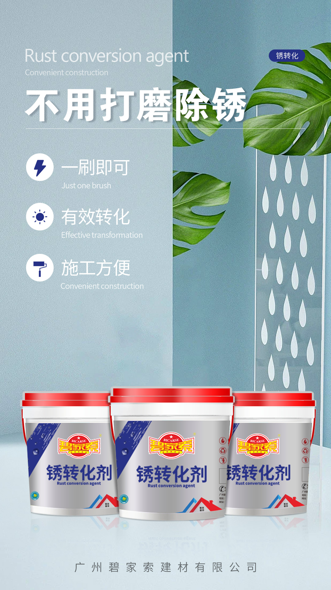 我司研发的产品采用改性的丙烯酸防腐底漆乳液和复合转化剂搭配而成的新一代水性铁锈转化产品,极具渗透力和很好成膜性,材料直达基层内部把生锈涂层转化为偏黑色的有机铁高分子化合物,该涂层固化后坚硬如铁,对基材有很好的附着力和防腐效果。本产品可喷可涂刷简单易施工,完全能代替人工除锈工艺。